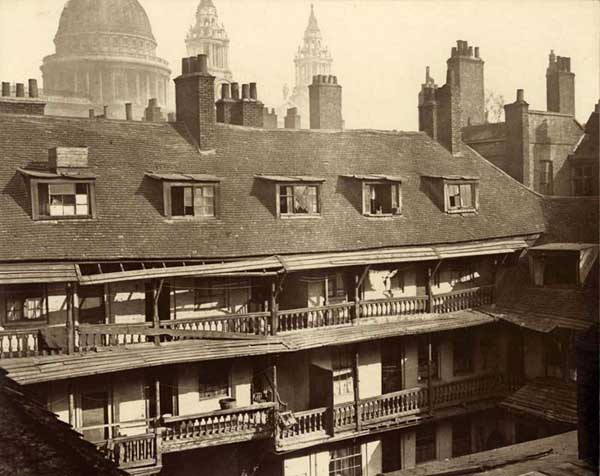 Thus, at the society’s behest, the Bools undertook a series of views of the Oxford Arms and, again, picturing the building in relation to its surroundings was felt to be important. One of most striking images in the seireis is a roof-top view showing the familiar dome of St. Paul’s Cathedral in the background. Over the next 3 years the Bools photographed a number of other historic sites for the society, notably St. Bartholomew’s and Cloth Fair, but their services were replaced by those of Henry Dixon in 1879.