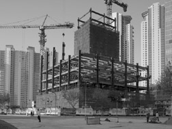 The constant visual interruptions of scenes of construction, destruction, and buildings resembling geometric cocoons wrapped with green nets banded with steel scaffolds and spidery cranes spinning their cables going up and down delivering bricks, stones, steel and things in between, the droning sounds of trucks, the rhythm of drills and pile drivers, the calls of workers amid the slosh of concrete boom pumps the blaring of horns amid stalled traffic. This is Shanghai at present.