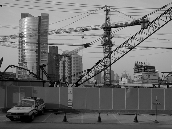 The constant visual interruptions of scenes of construction, destruction, and buildings resembling geometric cocoons wrapped with green nets banded with steel scaffolds and spidery cranes spinning their cables going up and down delivering bricks, stones, steel and things in between, the droning sounds of trucks, the rhythm of drills and pile drivers, the calls of workers amid the slosh of concrete boom pumps the blaring of horns amid stalled traffic. This is Shanghai at present.