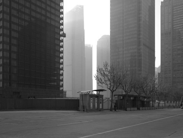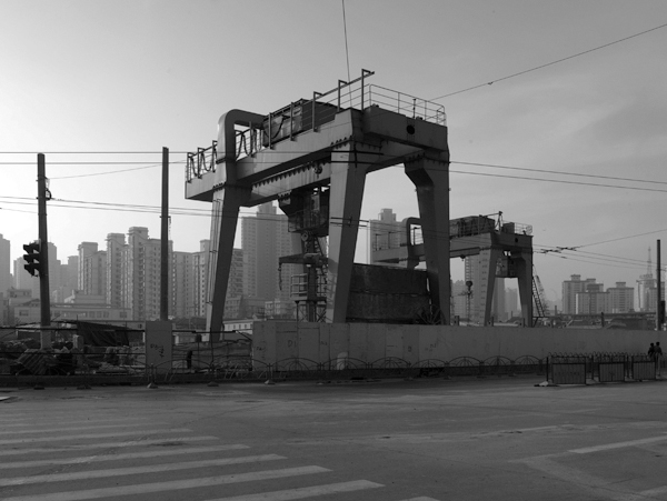 Early morning the cranes are still and streets deserted. The stillness of the early morning belies the nature of the city. That is usually the time I venture out to the city’s streets and take photographs. The buildings and structures at this time are silhouetted their forms outlined like sculpture, the sidewalks, streets and pedestrian lines form patterns while gantry cranes resemble four legged steel monsters walking the city.