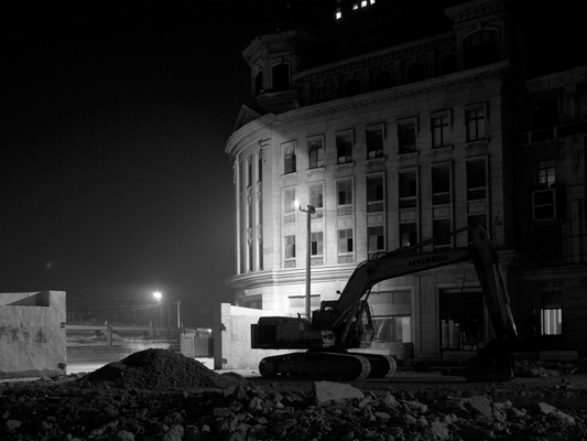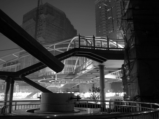 Early morning the cranes are still and streets deserted. The stillness of the early morning belies the nature of the city. That is usually the time I venture out to the city’s streets and take photographs. The buildings and structures at this time are silhouetted their forms outlined like sculpture, the sidewalks, streets and pedestrian lines form patterns while gantry cranes resemble four legged steel monsters walking the city.
