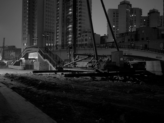 Early morning the cranes are still and streets deserted. The stillness of the early morning belies the nature of the city. That is usually the time I venture out to the city’s streets and take photographs. The buildings and structures at this time are silhouetted their forms outlined like sculpture, the sidewalks, streets and pedestrian lines form patterns while gantry cranes resemble four legged steel monsters walking the city.